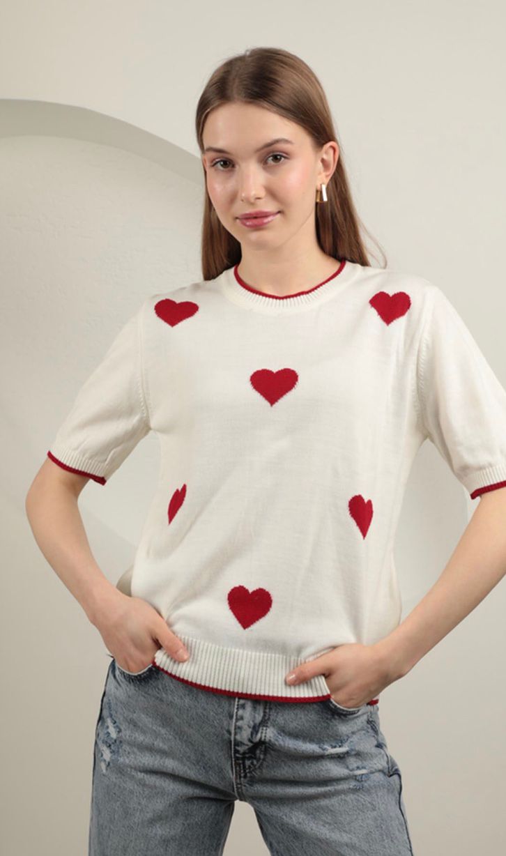 Triko çizgili kalp desenli kadın kısa kol bluz Standart beden O yaka Boyu : kemer üstü Renk : Beyaz