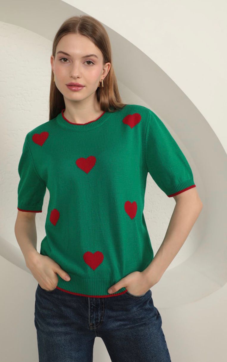 Triko çizgili kalp desenli kadın kısa kol bluz Standart beden O yaka Boyu : kemer üstü Renk : Yeşil