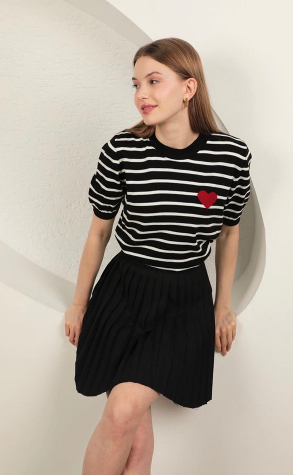 Triko çizgili kalp desenli kadın kısa kol bluz