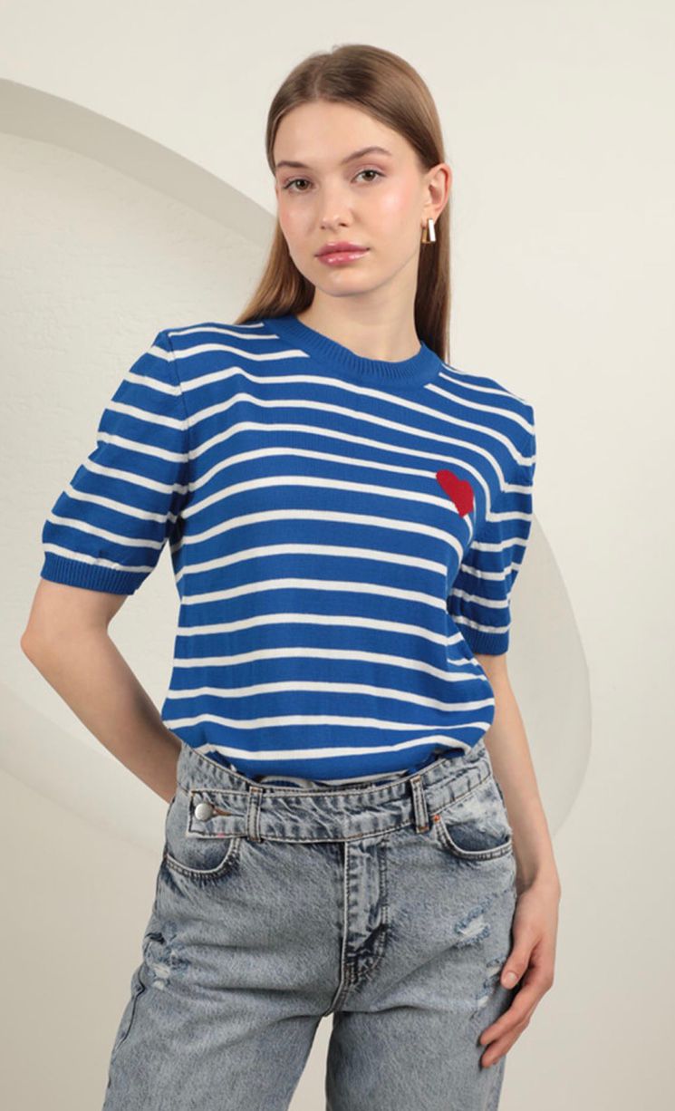 Triko çizgili kalp desenli kadın kısa kol bluz Standart beden O yaka Boyu : kemer üstü Renk : Mavi